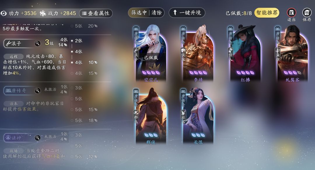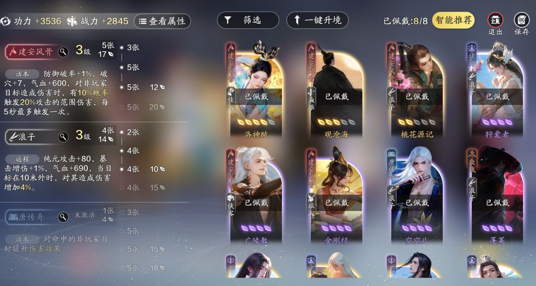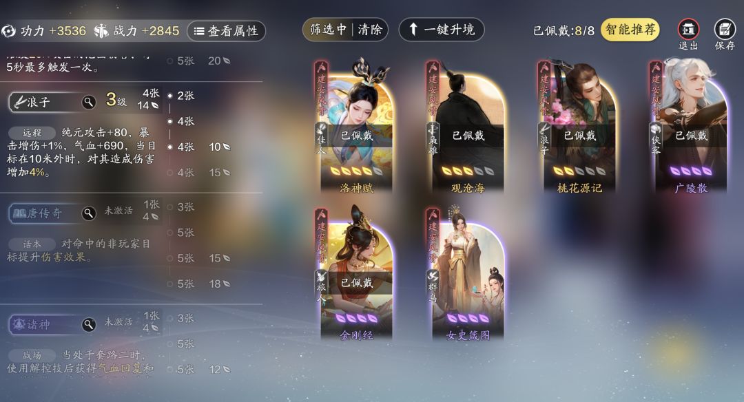 唐传奇同样为6张卡牌优先选择4张紫色的,其余的根据副羁绊来搭配即可。唐传奇的羁绊效果与建安风骨的差不多,差别就在于触发冷却时间要长一些;在满级后与建安风骨比少了打单一目标的伤害增益。少侠子在建安风骨羁绊还没有凑齐时,使用唐传奇平替也是不错的选择。