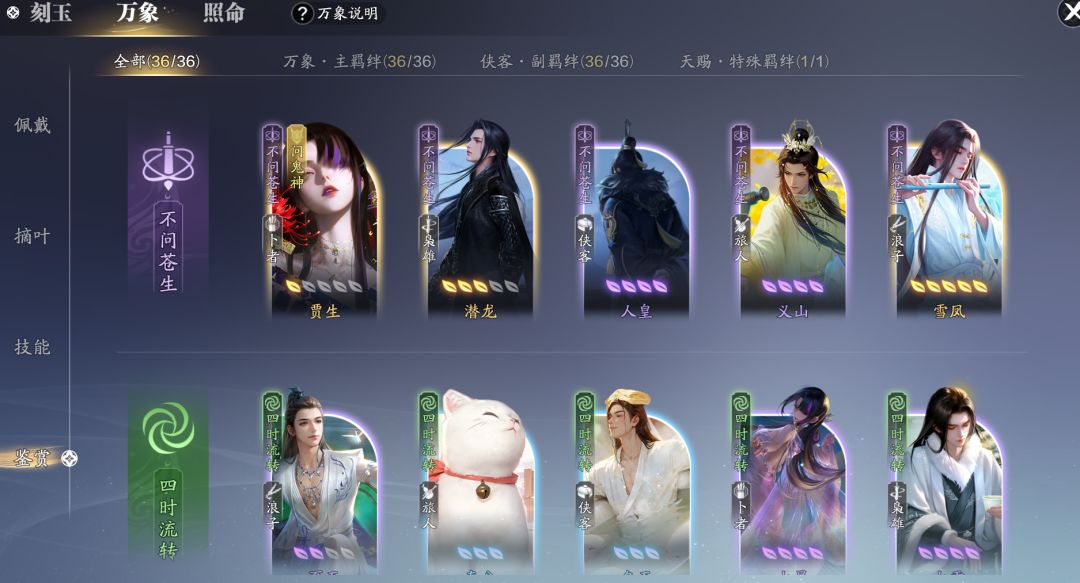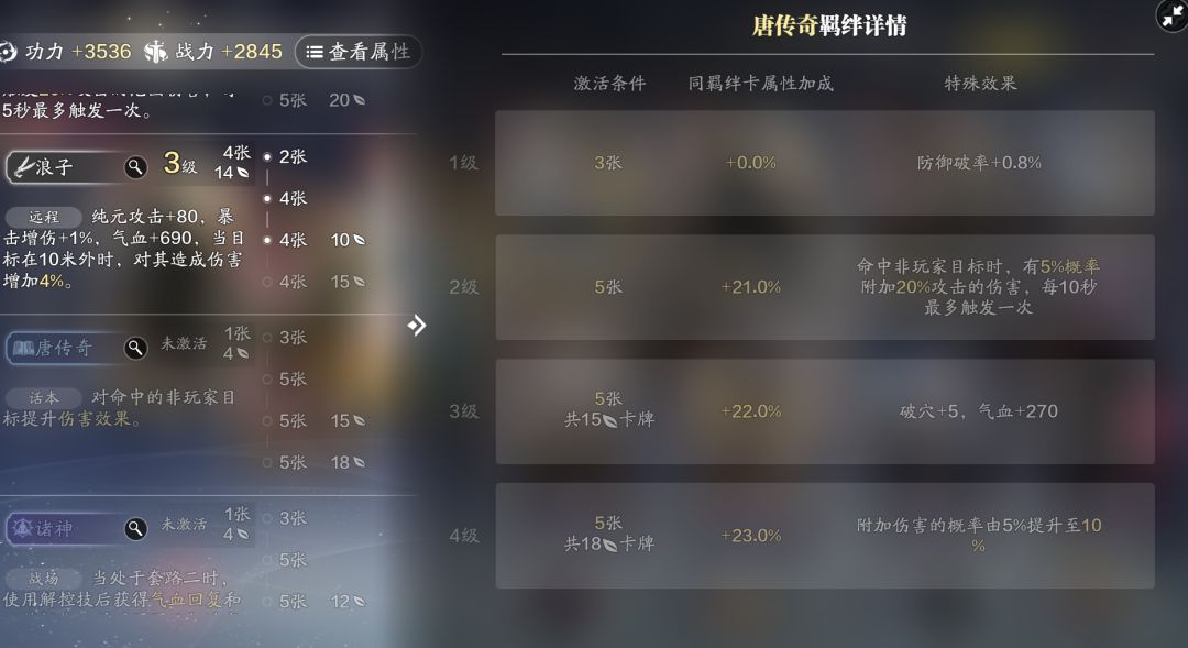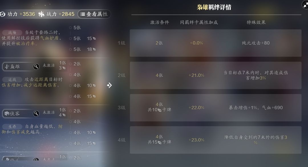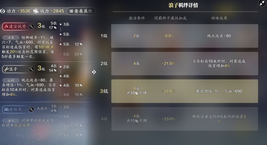 别急,别急,这点肯定也考虑进去的了,前面的主羁绊中,无论少侠是搭配的建安风骨还是唐传奇,里面都有一张卡牌的副羁绊是带有浪子、枭雄、侠客等技能的,也就是说少侠只需要额外凑够3张同样技能的副羁绊就可以激活最优的效果,至于3级4级则需要提升卡牌的境阶了。