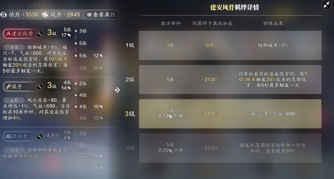 建安风骨一共6张卡牌,优先选择3张金色卡牌,剩余两张可以看副羁绊来搭配,在凑齐5张之后,可以为少侠带来羁绊效果:防御破率+1%,对非玩家目标造成伤害时,有10%概率触发20%攻击的范围伤害,每5秒最多触发一次。