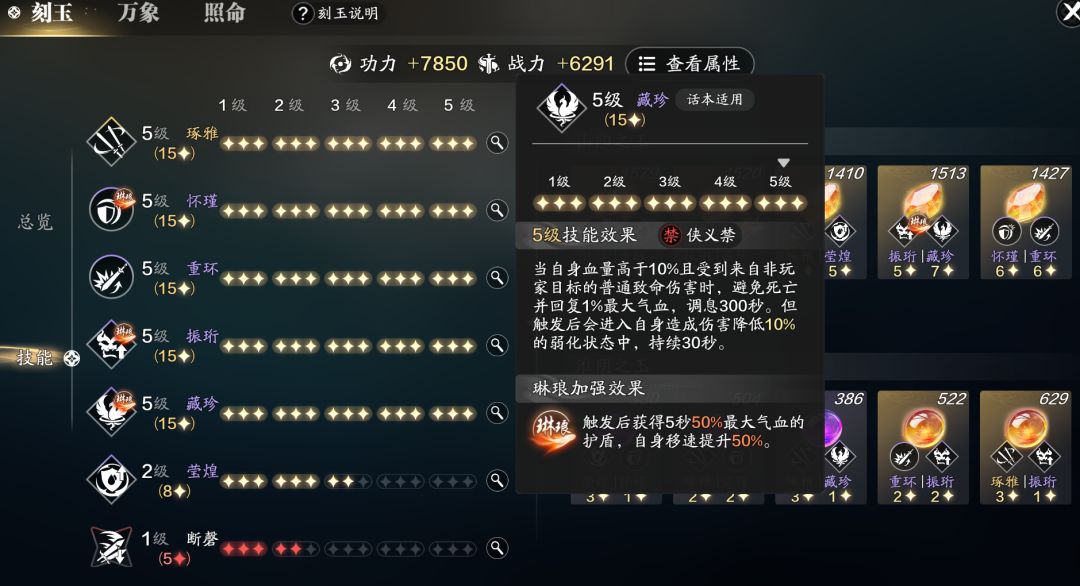 当然了,藏珍与怀瑾一个是减伤技能,一个是保命技能效果也还可以,只不过优先级没有琢雅、重环、振珩的高。