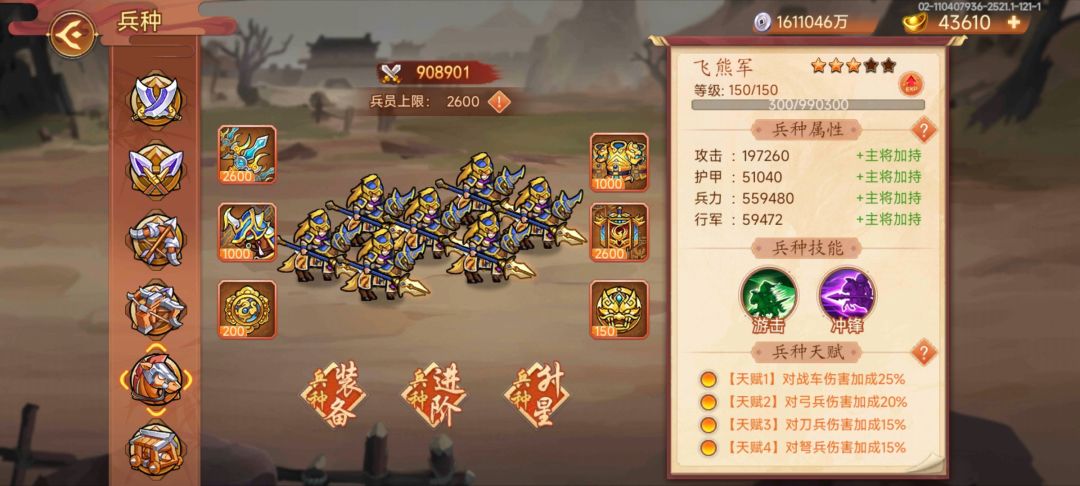 我兵魂升级选的是骑赵云(4级奔袭),枪典韦(1级恶来)+文鸯(13级勇毅),弩月英(13级强攻),车诸葛亮(10级复活)。