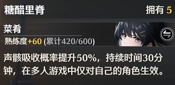 另外,无论是抽柯莱塔还是抽其他角色,清体力还是给队伍刷声骸,都逃不开无音区,柯莱塔和后面四名新角色用的声骸基本都在2.0,密音筒和开孔器的需求量不可能小,所以如果你不知道做什么,刷无音区就是最优解。黎那汐塔声骸之国,那么多声骸锄大地怎么能少了糖醋里脊,能够将声骸吸收概率提升到30%左右(乘算),闲来无趣烧烧饭包你用得上,什么,你问我哪里获取食谱,有笨蛋漂!菜谱的位置在乘霄山的中心信标位置,向前走几步来到定风铎商店,紫发小姐姐弹古筝这里,交付到四级就可以获取该食谱啦!(锄大地不努力,星声两行泪)
