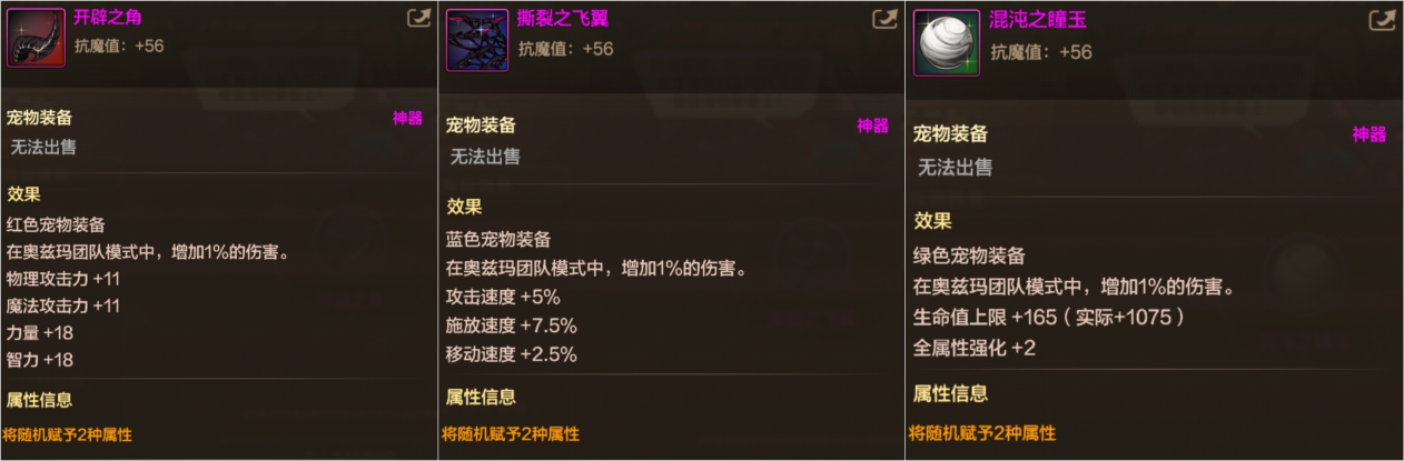 宠物装备属性值在“罗特斯宠物装备”的基础上要多出一个词条——“在奥兹玛团队模式中,增加1%的伤害”。