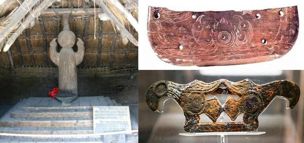 河姆渡先民很早就掌握了对于石器的打制、磨制、线切割、钻孔、刻划等技术,并将其运用到了生活的方方面面。在祭祀中,他们表现出了对太阳、鸟的崇拜,并以圆形、圆孔作为象征。我们提取了相关元素并重新创作出了符合曙光大陆特点的雕像,以此来表现女神峰上先民们的信仰和祭祀。