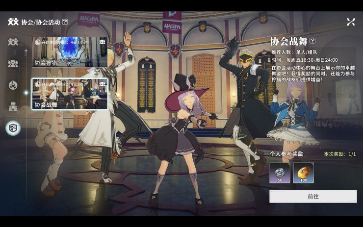 每周五18:30~周日24:00参加协会战舞,参与获得:50协会贡献币+100卢诺琥珀