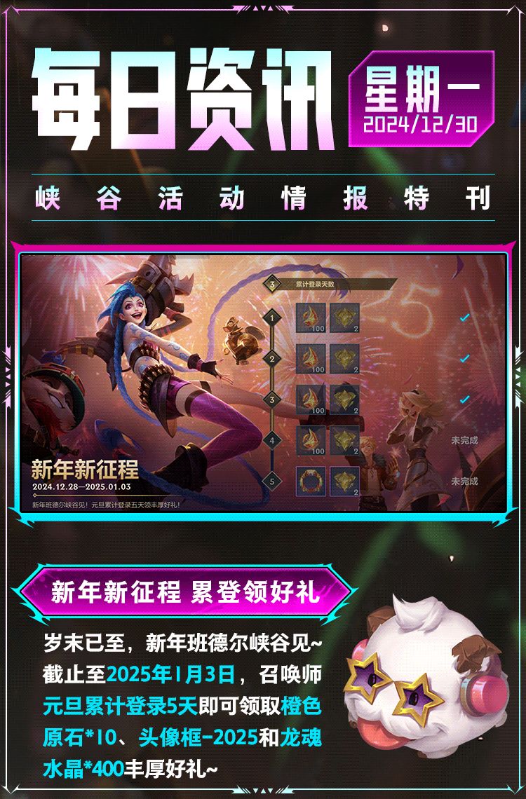 最适配的备战方案帮助召唤师赢下每一场精彩对局!隆哥最强力的福利提醒帮助召唤师不错过任何奖励~召唤师们记得登录游戏,领取周一登录幸运宝箱和福利好礼!开启宝箱后就有机会获得龙魂水晶、史诗皮肤随机魄罗宝箱奖励~