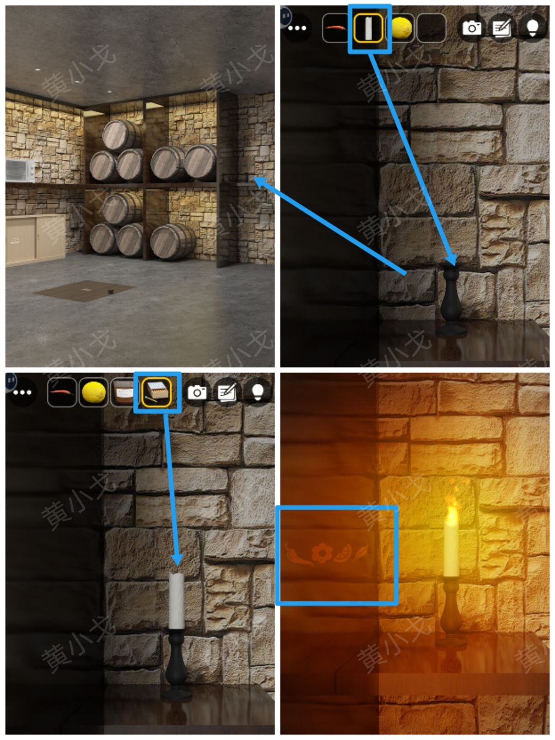 31.点击烛台,放上【蜡烛】,用【火柴】点燃,获得线索