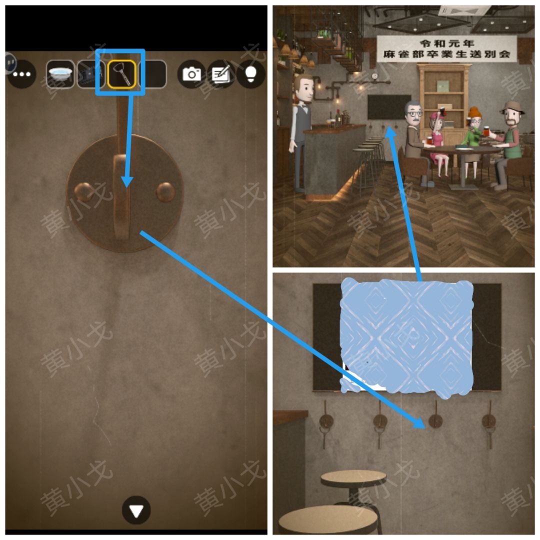29.点击柜子上的密码锁,根据[柜子]场景圆规的角度及上面的图案,结合[吧台]场景烟熏机烟雾的形状和顺序,调整密码锁