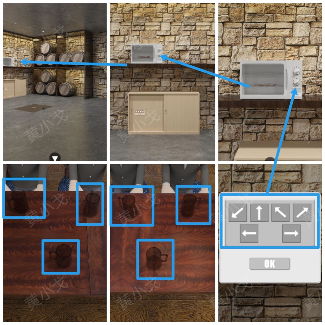 25.点击烤箱上的密码锁,根据[柜子]场景杯子的朝向线索,调整密码锁