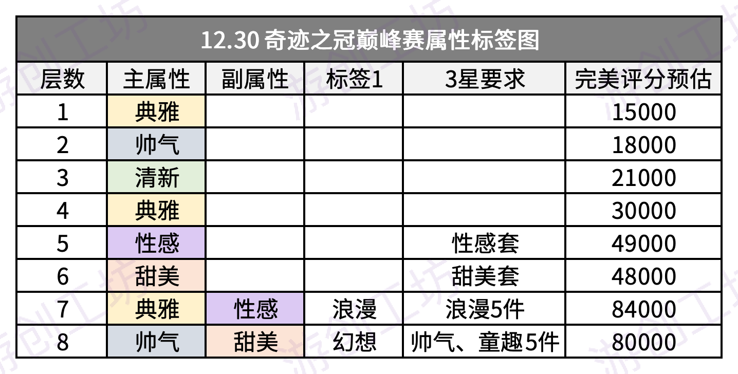 哈喽,搭配师们晚上好!1.1版本更新后奇迹之冠巅峰赛也更新了,900钻快速白嫖攻略来啦!本期巅峰赛前6关不难,第七关和第八关较难分数要求高,词条与当期限定套装词条一致。