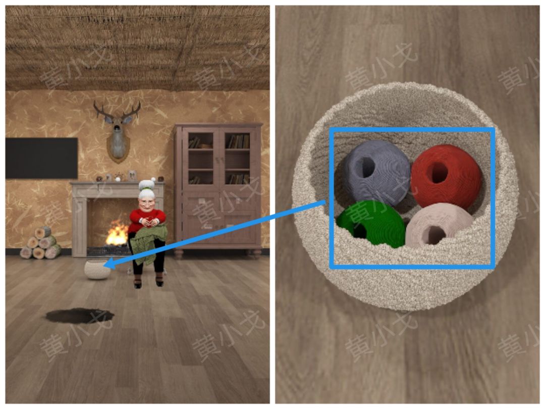 10.点击地上的木桶,根据[小屋]场景毛线团颜色及位置线索,调整密码锁