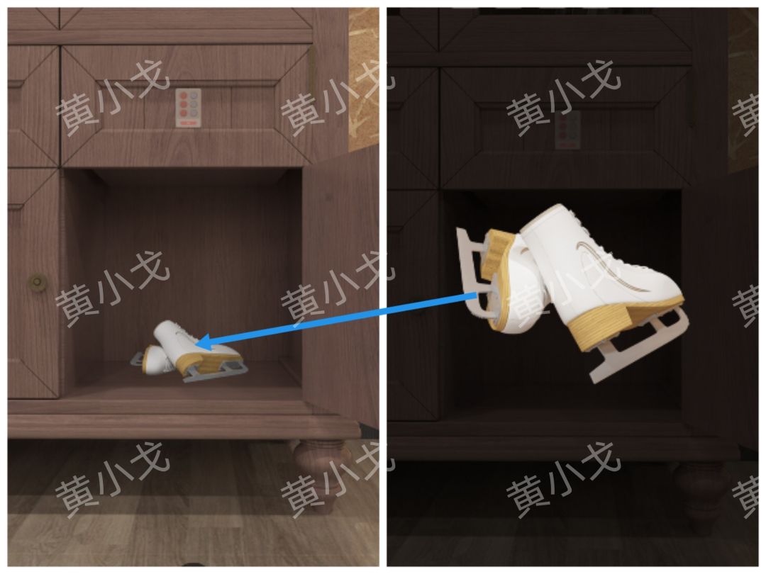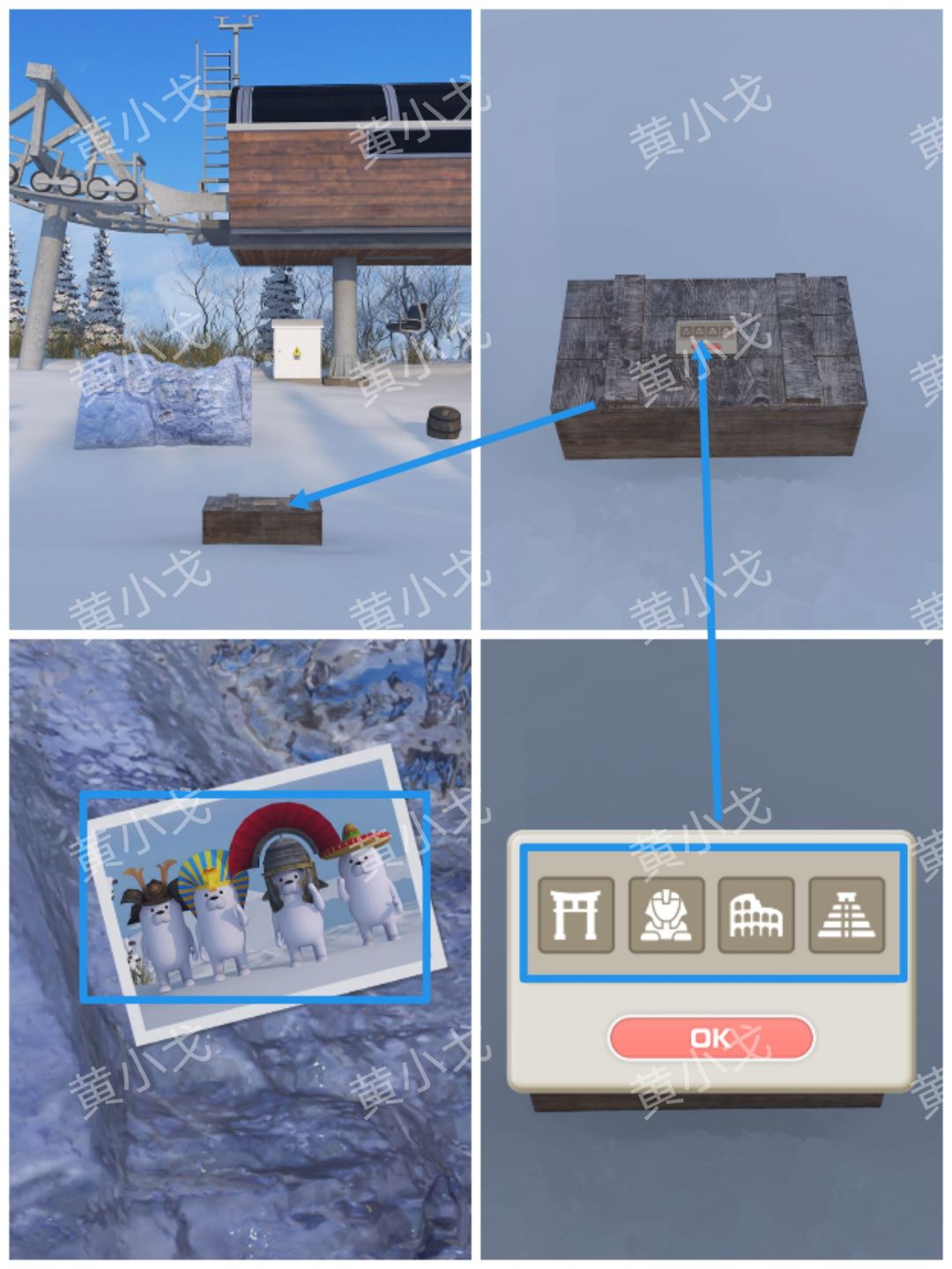 28.点击柜子右侧柜门,根据滑雪板在雪地上形成的形状线索,调整密码锁