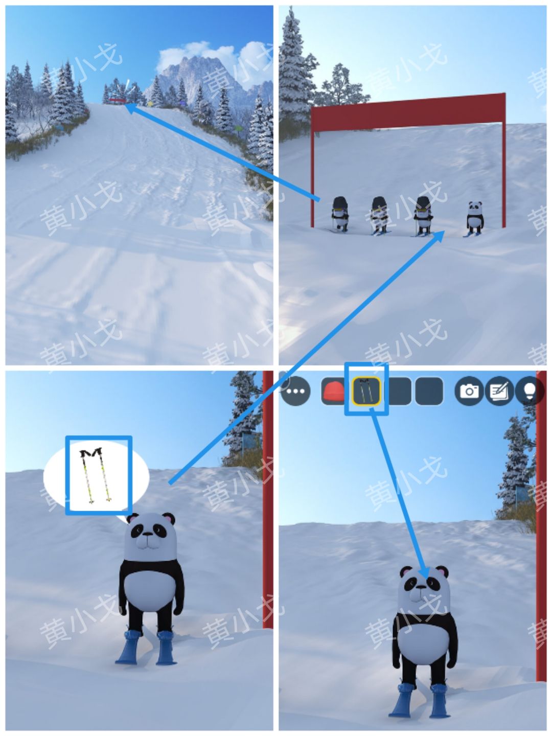 25.点击缆车,去到山顶;点击熊猫,得知它需要滑雪板,拿【滑雪板】给它