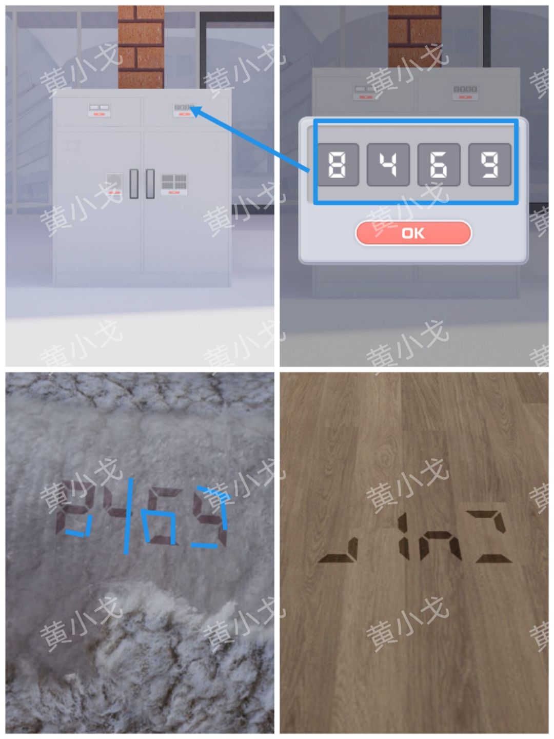 18.点击柜子右侧抽屉上的密码锁,根据[小屋]场景地上的符号线索和[小屋外]羊身上的符号线索,输入密码:8469