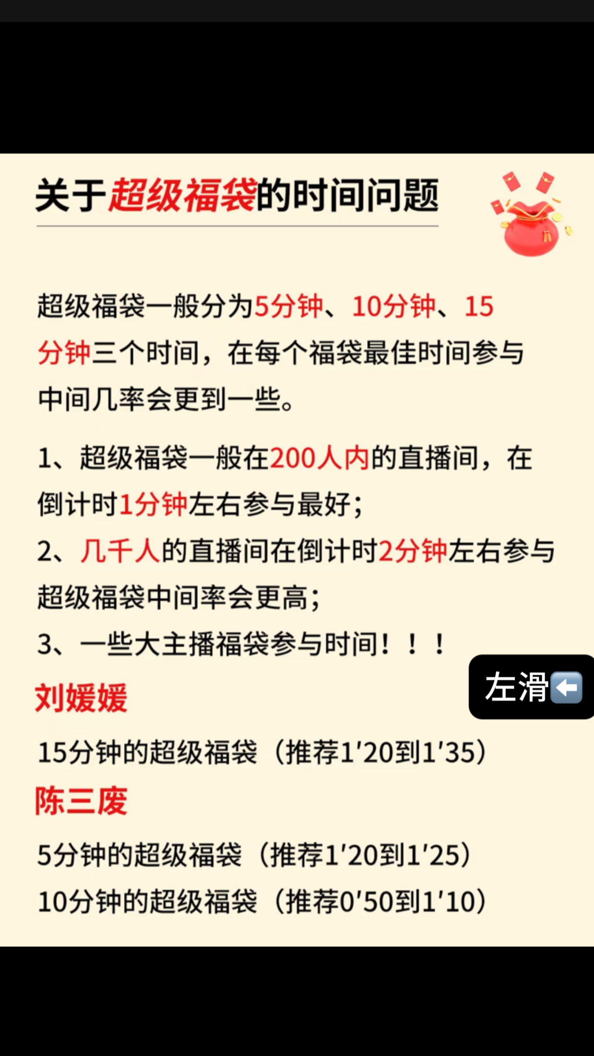 1.超级福袋一般在200人内的直播间,在倒计时1分钟左右参与最好;
