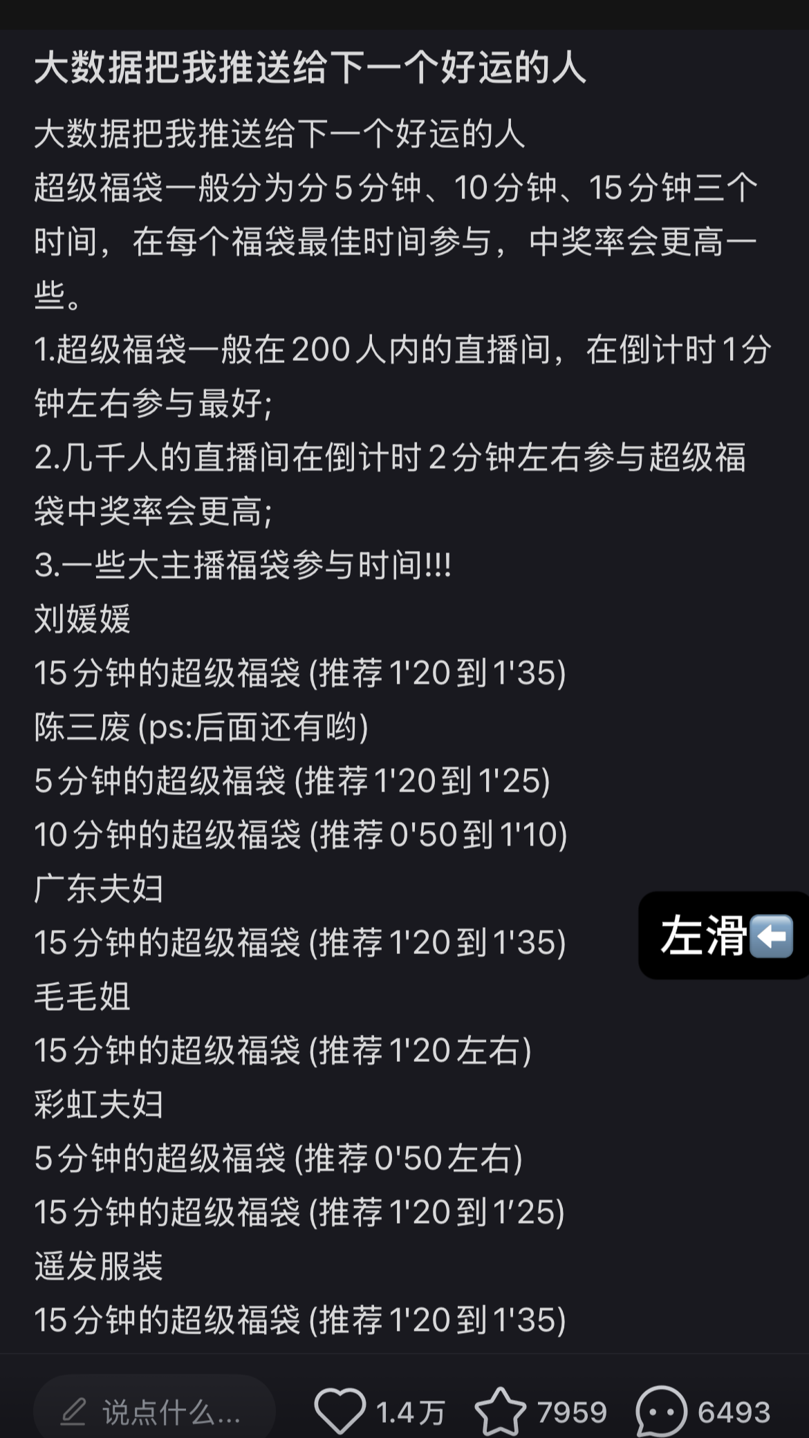 2.几千人的直播间在倒计时2分钟左右参与超级福袋中奖率会更高;