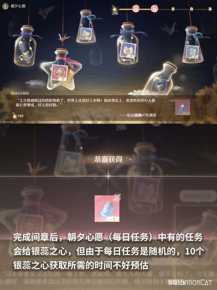 ⭐完成间章后,朝夕心愿(每日任务)中有的任务会给银蕊之心,但由于每日任务是随机的,10个银蕊之心获取所需的时间不好预估