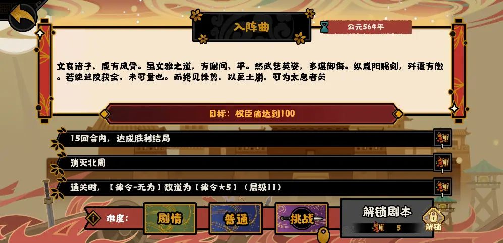 在兰陵王入阵曲的剧本中,可以看到在魏晋南北朝中加入了全新的政道【律令】与主要目标的权臣值,猜测应该是类似白袍北伐,需要通过一系列的剧情故事线,逐步提高自身的权臣值。