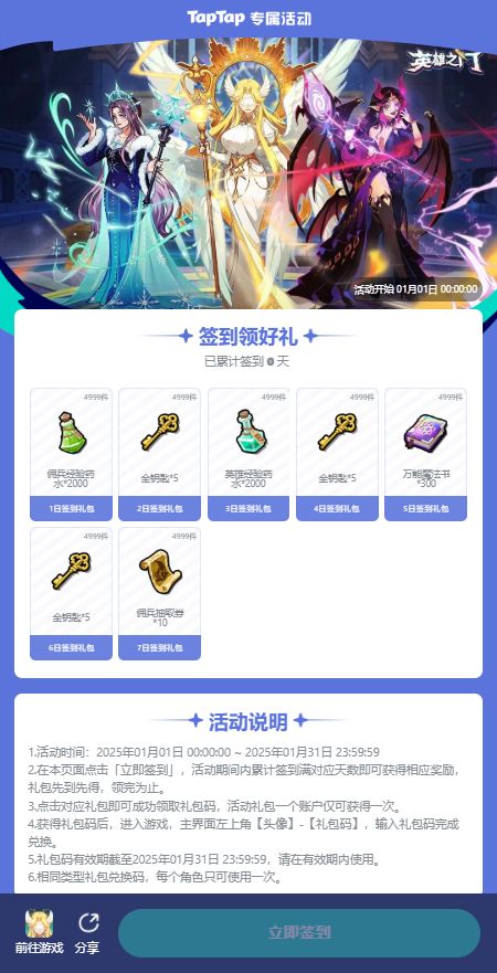 2025年1月签到福利活动将于1月1日上线!欢迎前往《英雄之门》TapTap签到页面参与活动。