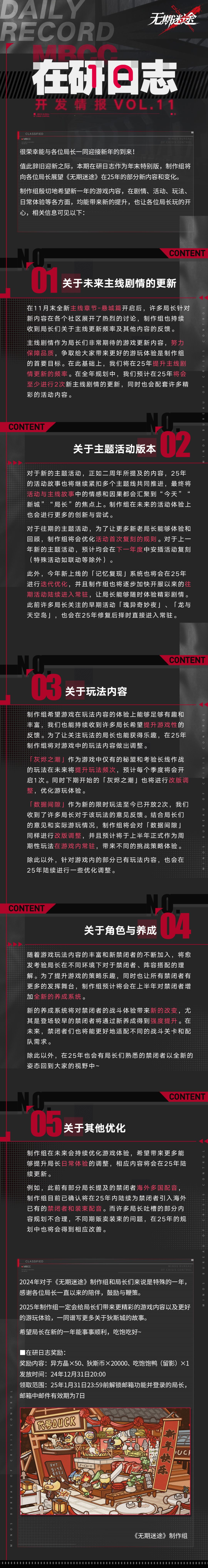 最新一期【在研日志】现已送达,本期将向局长们介绍即将在后续版本更新的重点内容,包括主线剧情、主题活动、玩法内容、角色与养成等,相关信息可见下图。