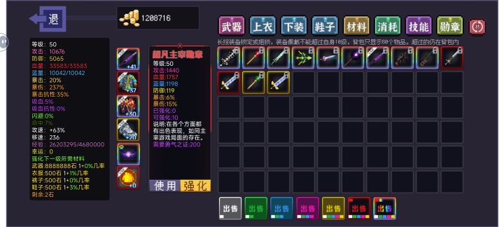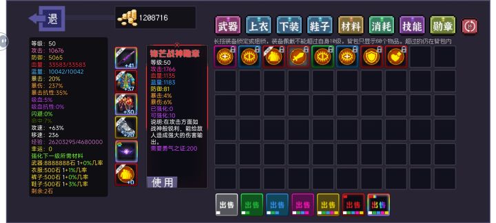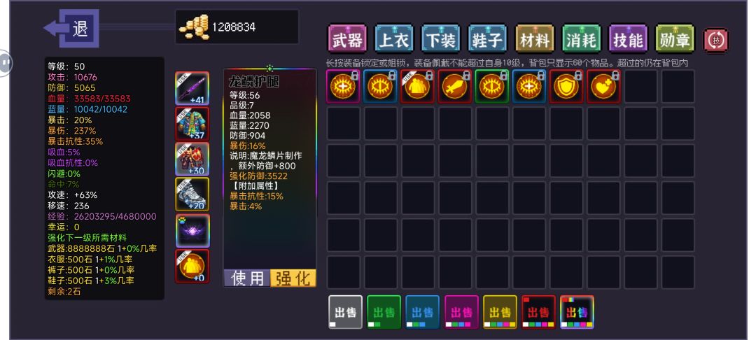 这次新版本玩了18个小时,花了一些时间肝天雷剑和天雷弓,有了自动瞄准之后葬花弓更好用一点,肝一些普通钥匙去新手村副本刷花尘,250个换一把符合当前等级的葬花弓。我50级的时候刷了三次全给红色弓,数值不如图片42级彩色的,就懒得再刷了。刷高级BOSS要彩色钥匙,裂缝NPC那可以换,30把高级换10把彩色。不知道或者打不过高级BOSS就多肝裂缝刷钱和买强化石去强化,有足够的钱很多事情都简单了。不过高级BOSS的爆率确实有点低,树王甲和魔龙腿我基本都刷了30次才爆,今天上午打15次蛇女一把专属装备都没给,就给了49个勇气之证——强化装备勋章的道具。我看论坛有些人打了一百多次都不爆,运气差有可能。最后建议刷累了就休息吧,这游戏想快速通关在50级tap版本还是难,觉得有用点个赞吧。