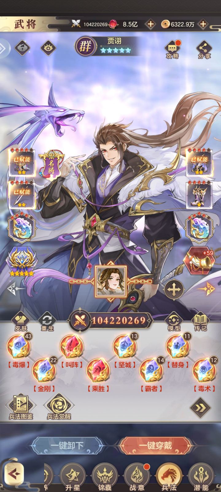 8、图腾方面,根据我的理解贾诩图腾都是选增加坦度的,个人选择120档的高级图腾选天府(针对袁绍这类,伤害减免)针对持续伤害可以选择开阳。普通点的就是国战可以白嫖到的文曲。