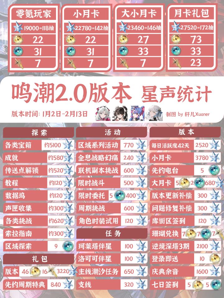 距离鸣潮2.0版本致缄默以欢歌更新只剩两天了,新的一年伴随着鸣潮新版本黎那汐塔而到来,想必是鸣潮玩家的最开心的跨年。轩儿这里给大家整理了2.0版本各类玩家所能获得星声和抽数,大家可以对号入座,探索内容以上线实际内容为准,这里仅根据之前版本规律做猜测。