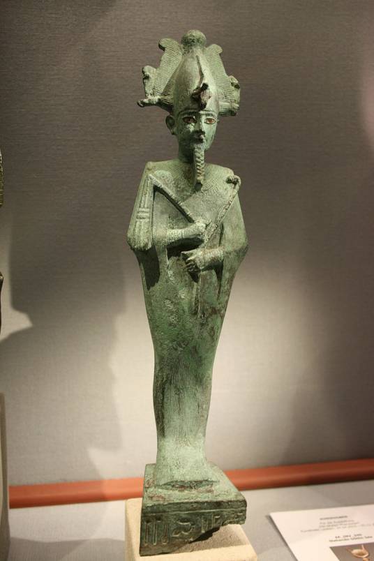 奥西里斯的形象是一个留着胡须、手持曲柄杖头戴王冠的绿色或蓝色木乃伊