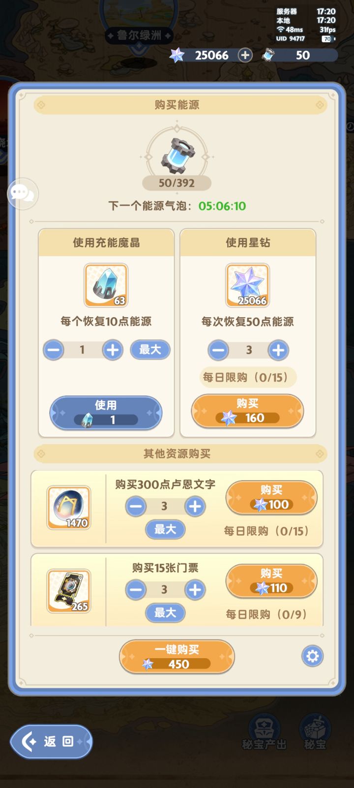 每日购买依旧购买3次能源¹、3次卢恩、3次门票、2次猫包,结算支出450钻;仓鼠百货6次超级成长零食、3次经验补剂,结算支出360钻;秘境之间3次机会,结算支出60钻石。每日共计结算支出870钻石(秘宝周购买2次礼包、皮肤券购买为周期内容,定为默认消耗)。