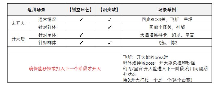 A+B > A/B 即【划空日芒】和【阳炎破】交替释放最佳 (除非需要保持距离,则单放前者)