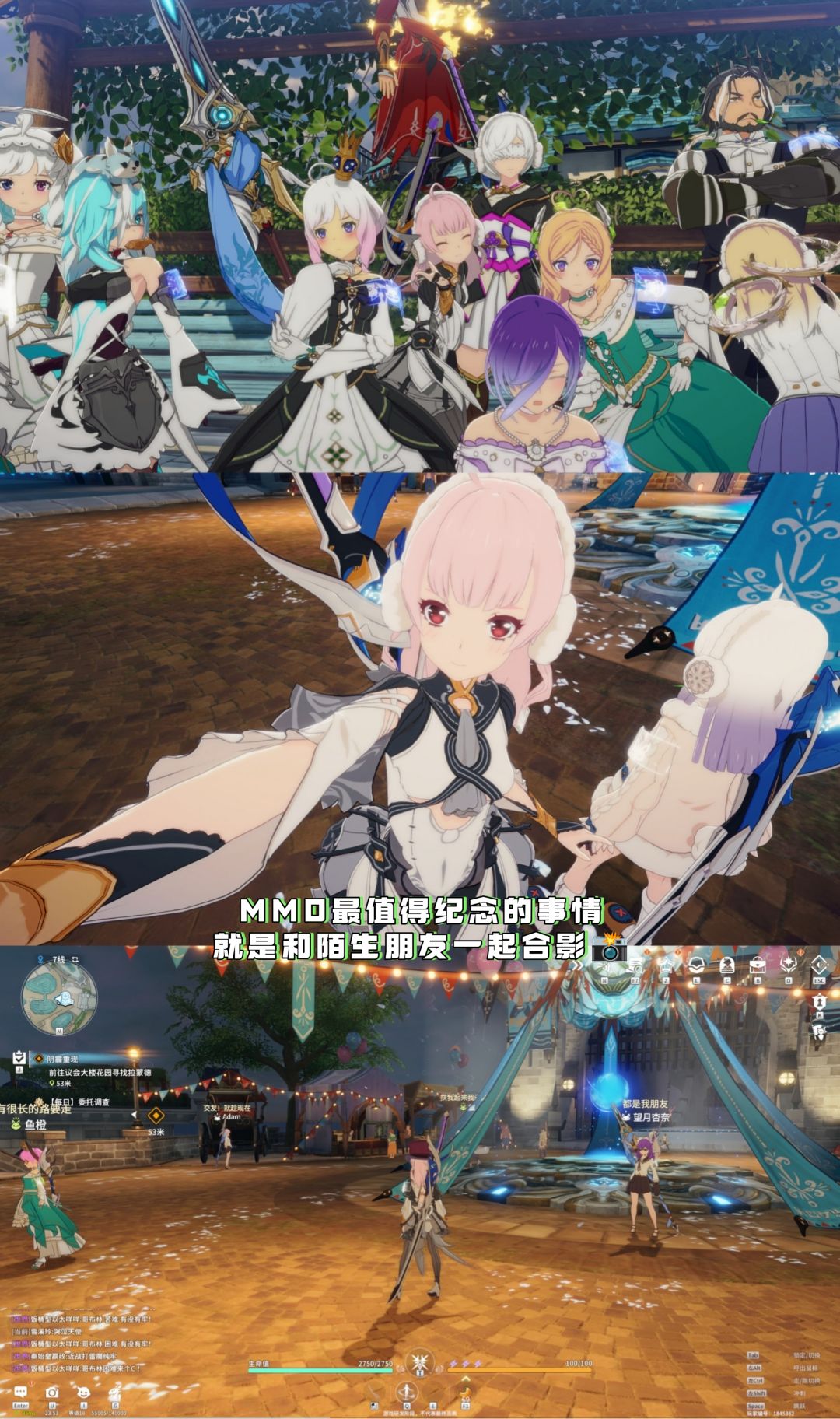 毕竟,MMO的核心是强社交。比如当我闲着没事在主城区闲逛时,看到很多美少女在一个长椅前合影拍照,我也忍不住凑上去照了几张合影。然后看到公屏发现他们很多都是玩过国际服的老玩家,因为“蓝协”死期将至,所以才和公会小伙伴暂时迁移到了这里。