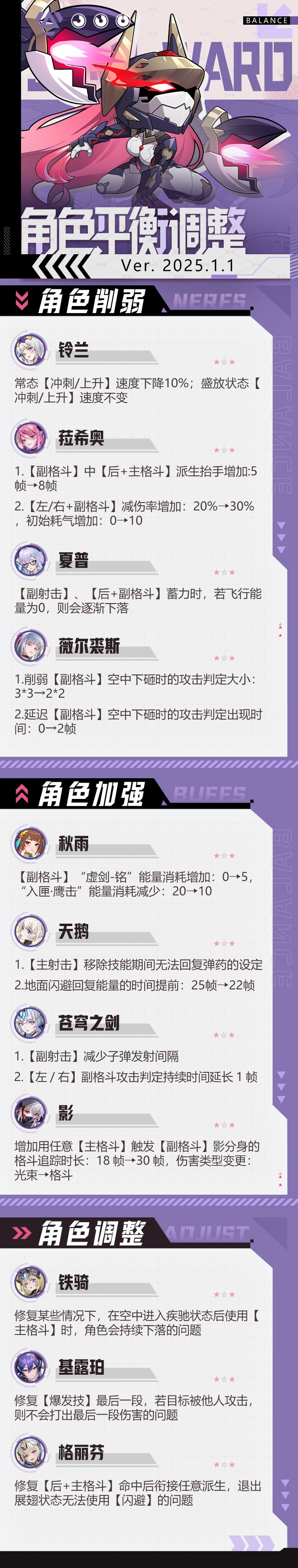 各位团长好,为了让团长们有更好的游戏体验,我们决定在1月2日游戏更新后对部分角色进行平衡调整,改动如下: