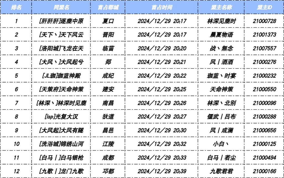 另外咱们“演武测试”攻城冲榜活动第二阶段——2级郡城首占最快的前12名同盟奖励名单已经出来啦,各位主公快来看看有没有你们盟吧!