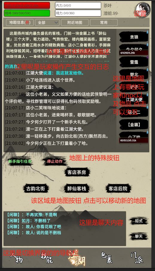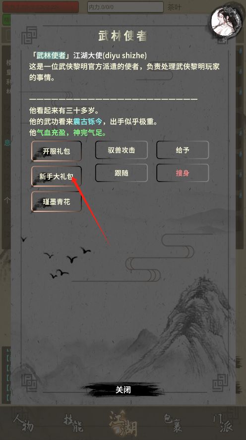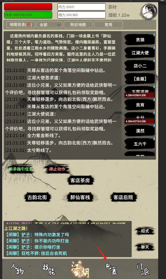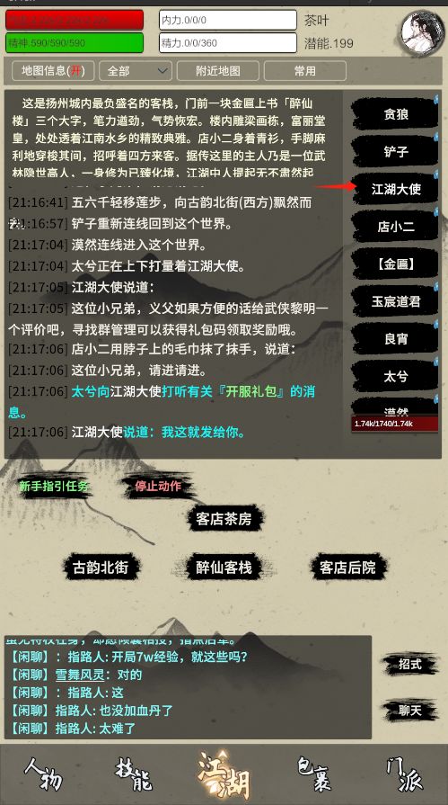 任务要求我们找 江湖大师聊一聊 点击明白以后 我们可以看到 在地图的npc区域 有一个叫江湖大使的人 我们点击和他进行交互!