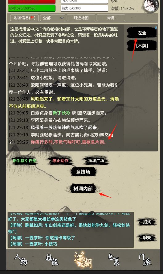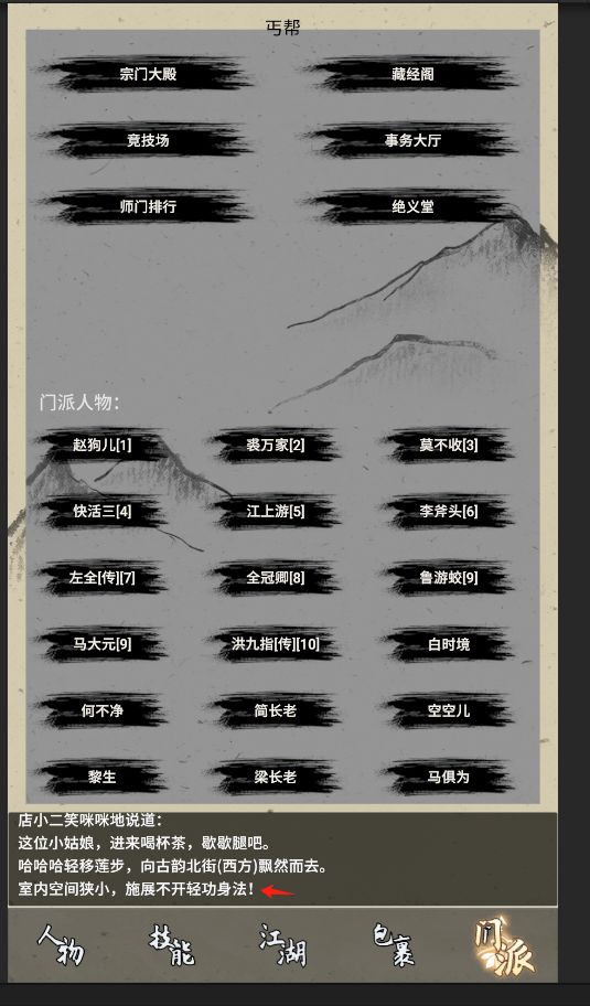 然后我再回到门派页面 继续去找左全!哎呀 这次就直接过去了!你看 果然 轻功还是要在房间外面使用!