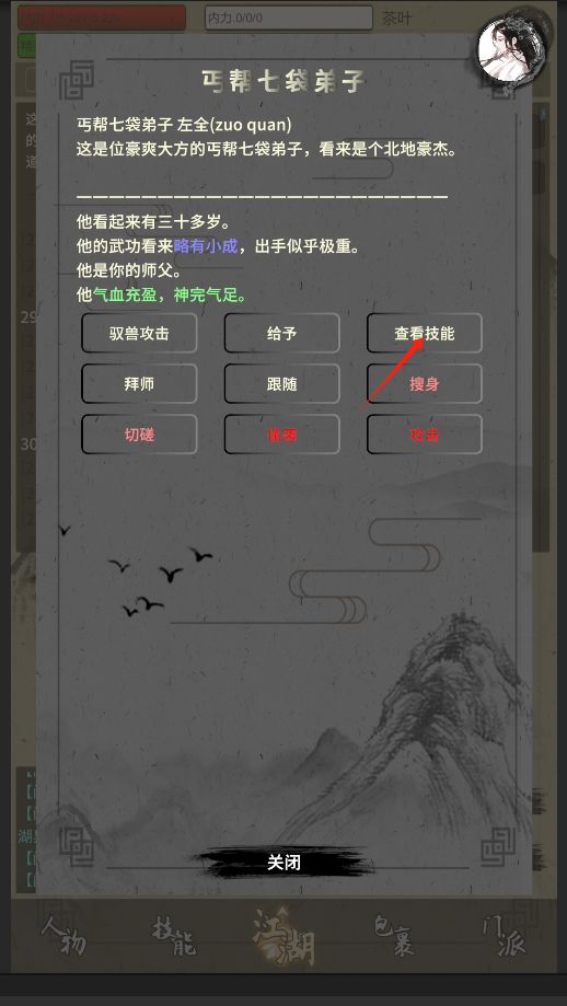 然后门派界面我们看到一个门派有很多的npc,这个时候怎么办,我们找谁当师傅好呢?看到npc名字后面的【传】字了吗 这些就是我们可以拜师的npc!如果你没达到要求有些师傅是不会要你的,要求可能是门派的技能你需要掌握到多少等级,也可能是你属性不对师傅看不顺眼!所以可以在群里看看每个门派对应的攻略!这里丐帮我们直接拜师左全!