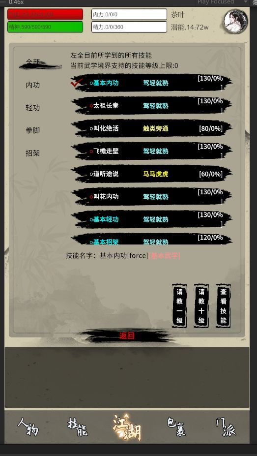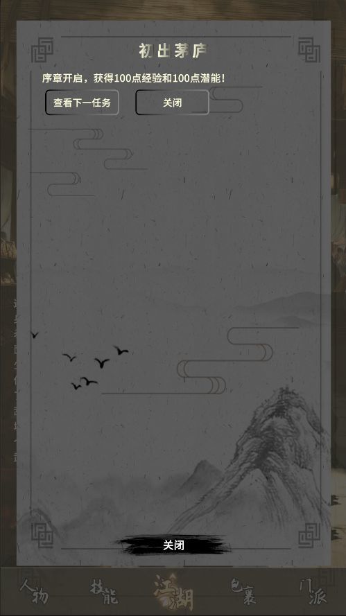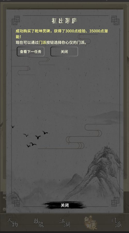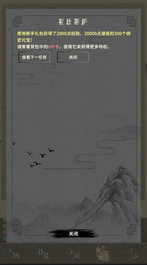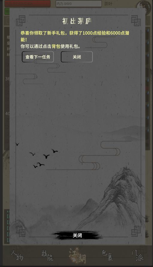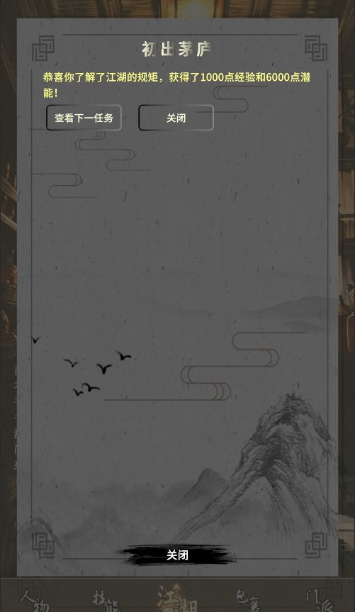 很好 简简单单完成后了第一个新手任务拿到了潜能和经验的奖励!潜能!关乎到我们提升自己的武学技能所需要花费的东西!经验!挂钩我们的玩家等级!而玩家等级影响了我们能学多少级的技能!那么我们跟着指引继续下一个任务!点击查看下一个任务!