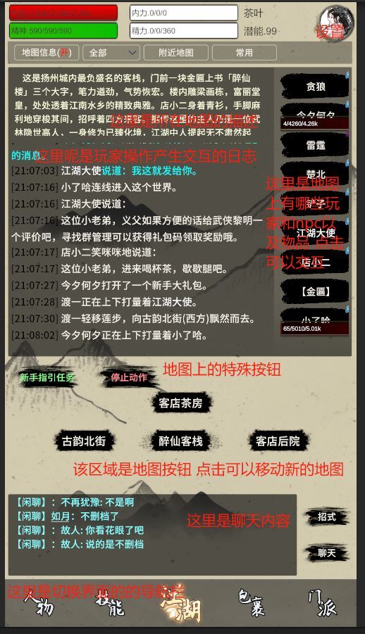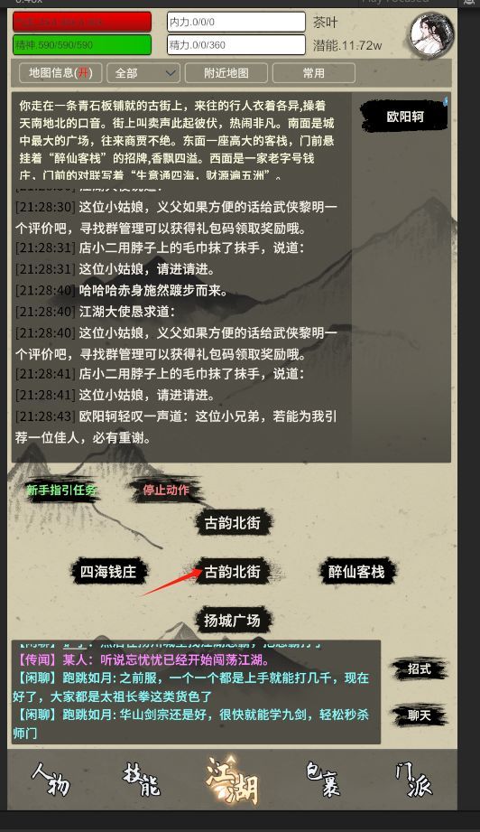任务要求我们找 江湖大师聊一聊 点击明白以后 我们可以看到 在地图的npc区域 有一个叫江湖大使的人 我们点击和他进行交互!