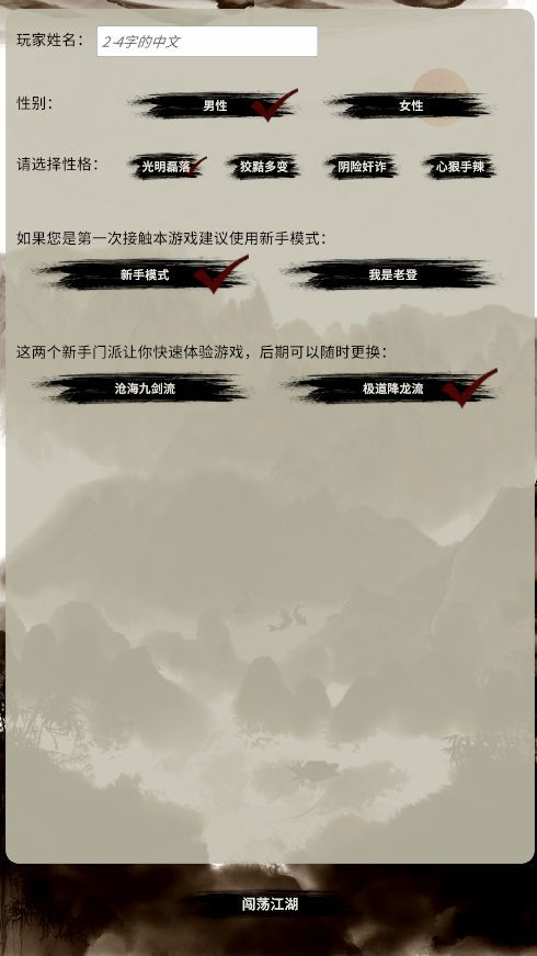 之后是需要玩家创建角色,需要输入玩家的姓名,要求为2-4个中文字符,如果提示昵称已经被使用,那就只好换一个了!推荐萌新选择新手模式,不需要在意 性别 性格 天赋 加点等一切东西,因为创建角色所能选的一切,后面游戏都可以免费更换,包括门派也是,不需要担心创建的角色属性不符合要求无法拜师,都可以换!而且你在新手门派呆到熟悉玩法以后,是可以在退出门派的时候返还提升技能的所有消耗的!所以 我们作为一名萌新 我们按照萌新选择 第一个剑法就是华山 第二个降龙就是丐帮!我这里以丐帮为演示!开始闯荡江湖!