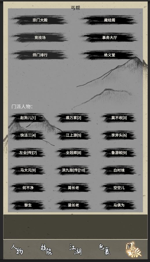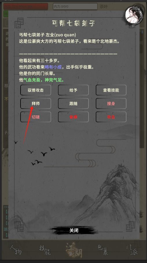 然后门派界面我们看到一个门派有很多的npc,这个时候怎么办,我们找谁当师傅好呢?看到npc名字后面的【传】字了吗 这些就是我们可以拜师的npc!如果你没达到要求有些师傅是不会要你的,要求可能是门派的技能你需要掌握到多少等级,也可能是你属性不对师傅看不顺眼!所以可以在群里看看每个门派对应的攻略!这里丐帮我们直接拜师左全!