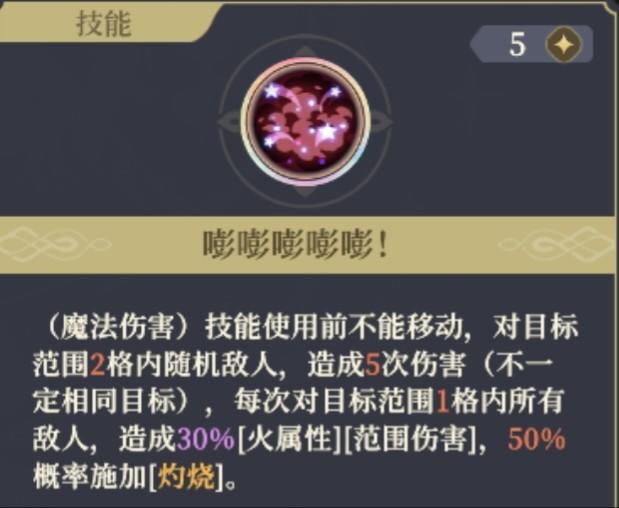 [点燃]:减益,所属生命流失类;行动结束时,损失施法者物攻值与魔攻值之和的25%生命值。