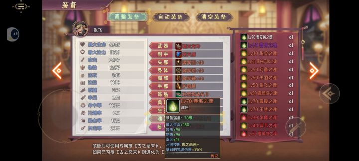 5、LV70典韦之魂:最大生命+150,攻击+90,物防+90,幸运+15,受到的物理伤害*95%,习得技能:古之恶来