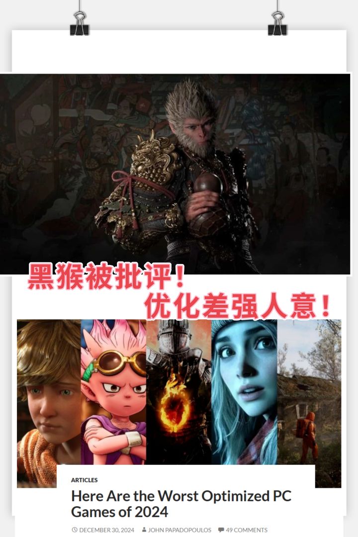 年末各类排行榜纷纷出炉,其中不乏「最差」类别的评选。 近日,知名外媒DSOGaming发布了《2024年最差PC优化游戏》排行榜。而备受关注的《黑神话:悟空》也不幸名列其中。
