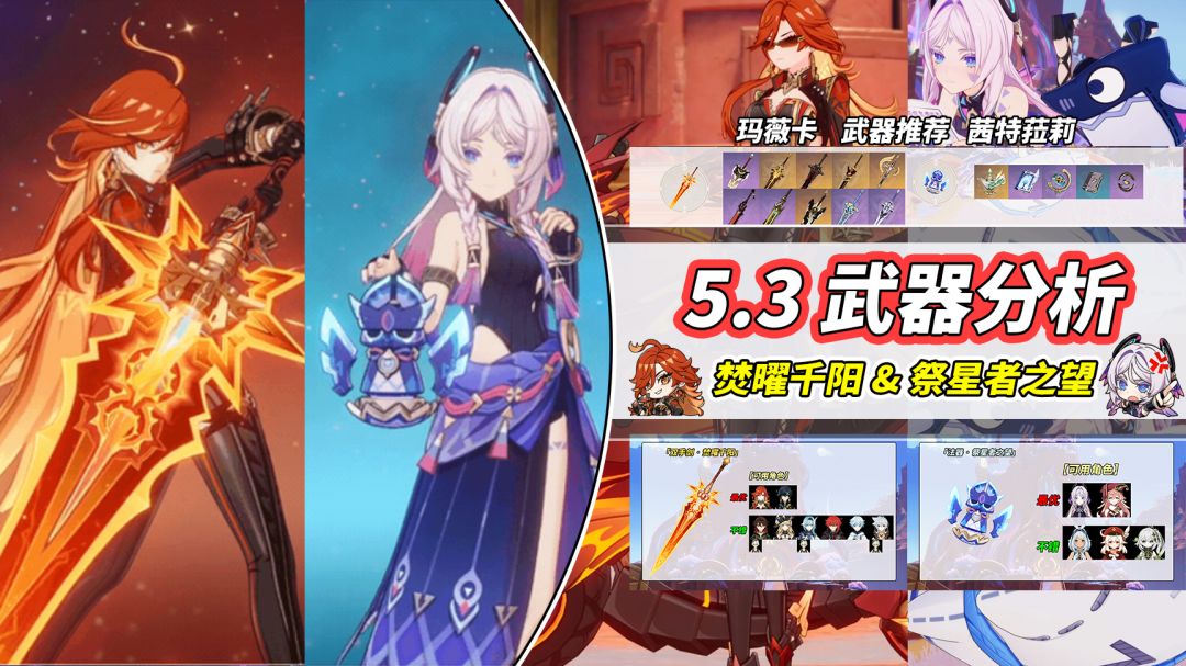 此次5.3版本新增2把限定武器「双手剑·焚曜千阳」、「法器·祭星者之望」,除了对应的玛薇卡、茜特菈莉,又有哪些老角色可以借此机会换新装呢?这期就来一块聊聊~