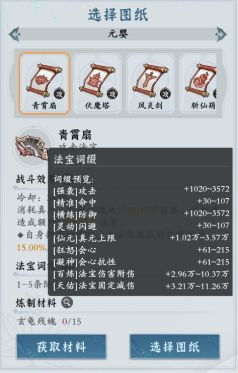 法宝在炼器获取时会随机获得词缀。普通词缀可以在炼器-图纸界面,点击【法宝词缀】可预览;特殊词缀则不会显示在预览中,只有炼器获取该词缀之后可以在法宝界面查看(p1)