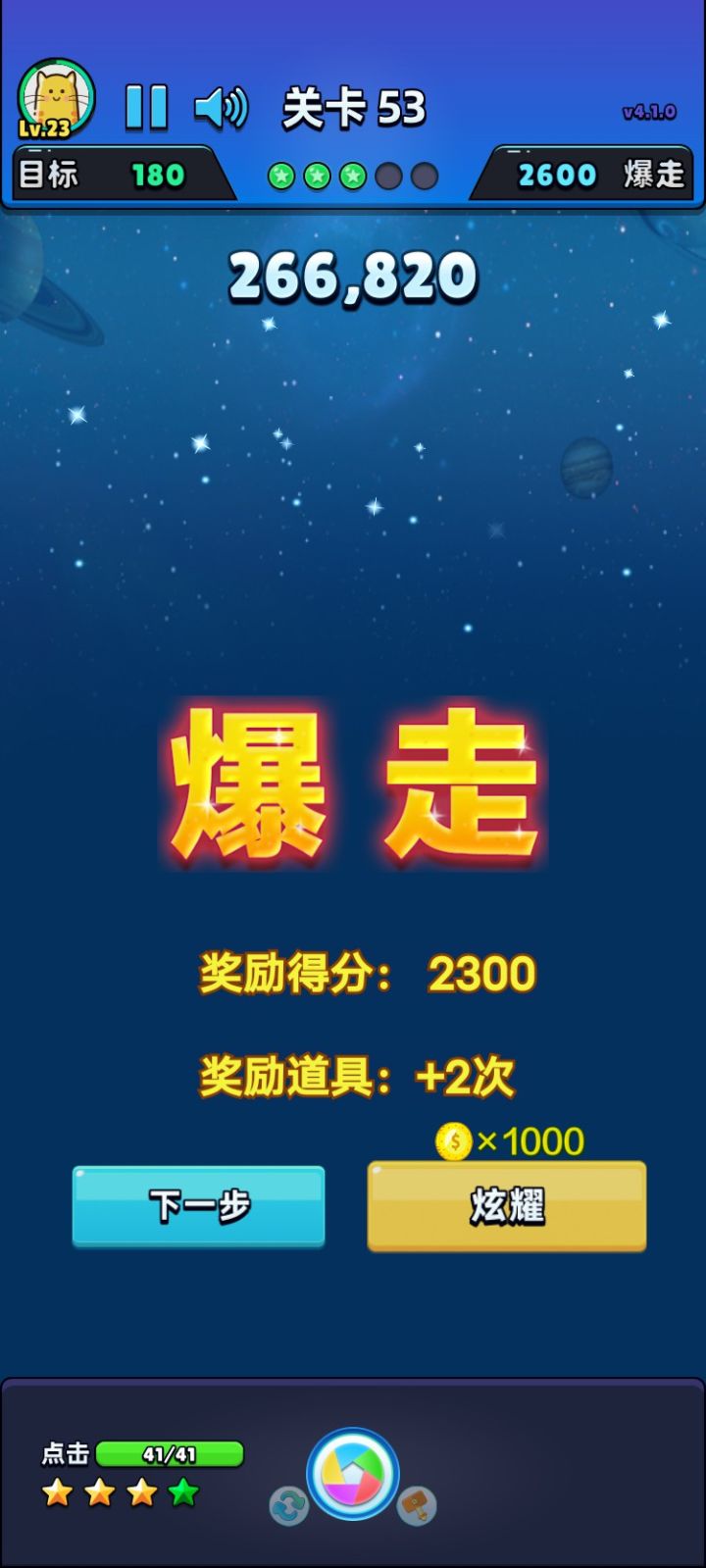 我消除了所有星星,完成第116次爆走了!!!获得2300分奖励!
