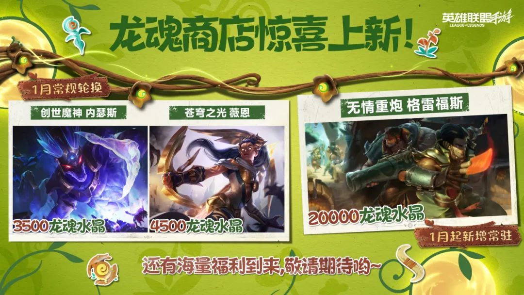 龙魂商店惊喜上新啦!1月常规轮换即将开启,创世魔神 内瑟斯与苍穹之光 薇恩轮换上架,新增常驻皮肤无情重炮 格雷福斯,快来龙魂商店兑换心仪的皮肤吧~还有海量福利到来,敬请期待!