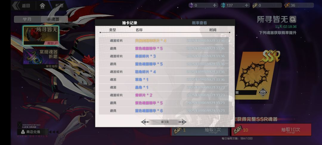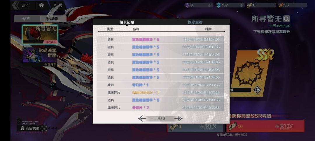大号抽魂器的时候,已经出现过一次bug了,出了金色特效,结果是个辣鸡蓝,然后开小号,终于可以抽魂器,36票,30连时出了金色特效,结果是个辣鸡蓝,如图,又单抽6次,惊奇发现保底次数居然重置了!!!!!看了记录,看了背包,根本没有金色魂器!!!求刃镜官方重视,加急修复bug!!!!