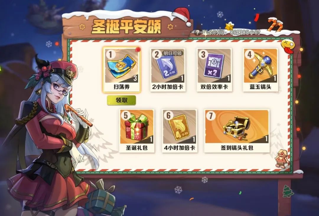 圣诞节送惊喜福利,签到轻松赢好礼!活动期间内,指挥官们可通过累计签到领取扫荡券、双倍效率卡、圣诞礼包、4h加速卡、镐头礼包等,快来把他们捧回家吧!