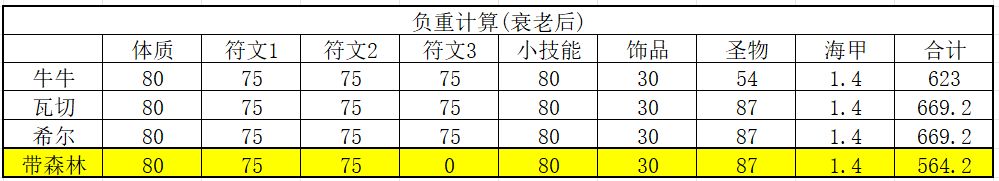 ~苗子衰老前的负重不讨论,衰老后要带全套装备的最低要求是530.8负重,灰烬多118负重同样也多50防御,性价比很高
